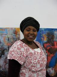 Mercy Moyo began to draw as a very young person and used her drawings to describe the world around her and tell the story of life in contemporary Africa. Her images are primarily collages, incorporating objects, which complement and reinforce the images depicted. She uses oil, acrylics, charcoal, smoke from candles and pencils to create vibrant images of contemporary women in Zimbabwe today. One of her goals is to use her art to showcase the beauty of African women be they from the village or the capital city of Harare, portraying the real African woman – in her long skirts, fuller figure, with her head nicely covered abiding by the norms and rules of the typical African way of life. Mercy has exhibited multiple times at the National Gallery of Art, Zimbabwe and her work has also been included in shows in the Czech Republic, Finland, South Africa, and the US. She is the first woman artist to win the National Arts Merit Award for two-dimensional work in Zimbabwe (2006) and has received a number of residencies. She studied at the Peter Birch School of Art and Design and the National Gallery of Zimbabwe Visual Art Studios.