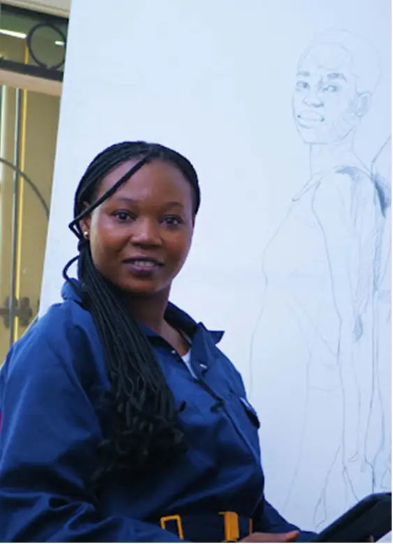 Mercy Moyo began to draw as a very young person and used her drawings to describe the world around her and tell the story of life in contemporary Africa. Her images are primarily collages, incorporating objects, which complement and reinforce the images depicted. She uses oil, acrylics, charcoal, smoke from candles and pencils to create vibrant images of contemporary women in Zimbabwe today. One of her goals is to use her art to showcase the beauty of African women be they from the village or the capital city of Harare, portraying the real African woman – in her long skirts, fuller figure, with her head nicely covered abiding by the norms and rules of the typical African way of life. Mercy has exhibited multiple times at the National Gallery of Art, Zimbabwe and her work has also been included in shows in the Czech Republic, Finland, South Africa, and the US. She is the first woman artist to win the National Arts Merit Award for two-dimensional work in Zimbabwe (2006) and has received a number of residencies. She studied at the Peter Birch School of Art and Design and the National Gallery of Zimbabwe Visual Art Studios.